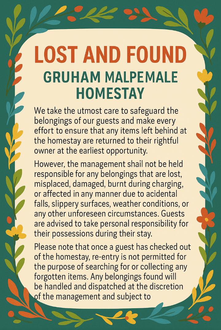 We take the utmost care to safeguard the belongings of our guests and make every effort to ensure that any items left behind at the homestay are returned to their rightful owner at the earliest opportunity. However, the management shall not be held responsible for any belongings that are lost, misplaced, damaged, burnt during charging, or affected in any manner due to accidental falls, slippery surfaces, weather conditions, or any other unforeseen circumstances. Guests are advised to take personal responsibility for their possessions during their stay. Please note that once a guest has checked out of the homestay, re-entry is not permitted for the purpose of searching for or collecting any forgotten items. Any belongings found will be handled and dispatched at the discretion of the management and subject to availability of staff and logistical feasibility. We strongly encourage all guests to double-check their rooms and ensure they have all personal items with them before departure.